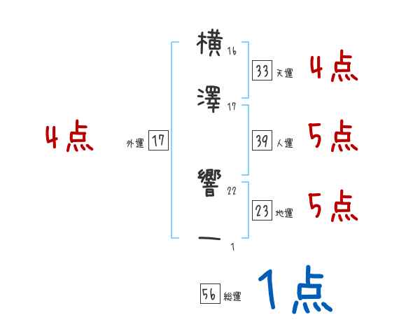 総運![]() | 横澤響一さんの総運は56画の1つ星!消極的で無気力になりがち。誠実な気持ちが必要でしょう。 あなたの人生を表す1番重要な運勢です。生涯を通じて影響する総合運となり、主に50歳以降の晩年期に影響を及ぼします。 |