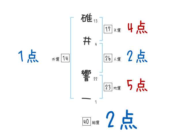 外運![]() | 碓井響一さんの外運は14画の1つ星!人に対して優しいがストレスを溜め込みがち。人間関係のトラブルを避けるよう気をつけましょう。 生活面を象徴する運勢です。外部から受ける影響力を表し、結婚運、家庭運や職場、環境への順応性を表します。 |