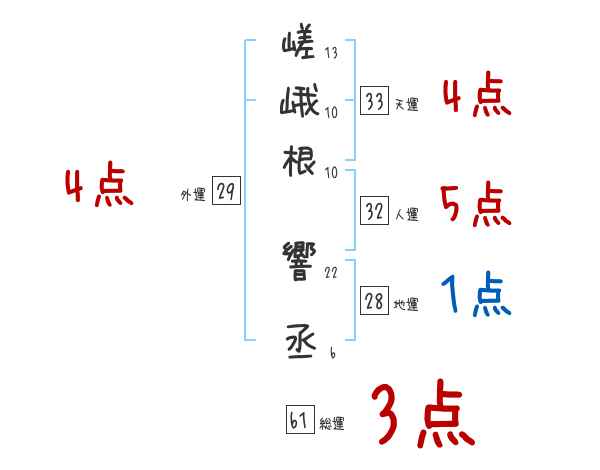 人運![]() | 嵯峨根響丞さんの人運は32画の5つ星!柔軟性があり成功する。チャンスが多く金運が良い。 性格や才能などを表す2番目に重要な運勢です。人間関係や協調性、社会的な成功に影響します。主に20歳から50歳ぐらいまでの中年期の運勢を表します。 |