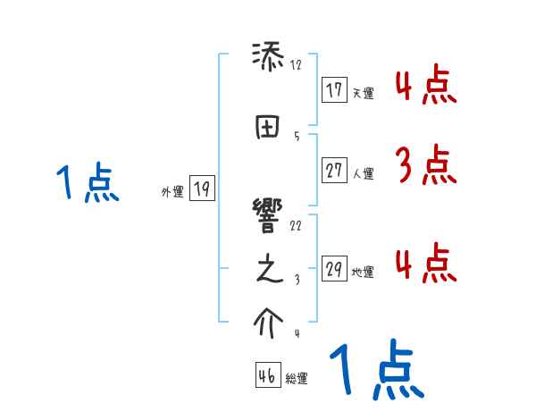 外運![]() | 添田響之介さんの外運は19画の1つ星!優れた才能を持ちますが、協調性が足りないことも。周りの人と協力する事を意識しましょう。 生活面を象徴する運勢です。外部から受ける影響力を表し、結婚運、家庭運や職場、環境への順応性を表します。 |