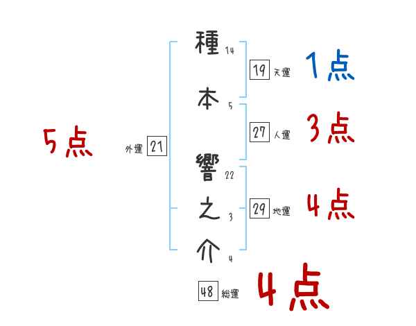 総運![]() | 種本響之介さんの総運は48画の4つ星!賢明な性格で人望が厚い。指導力があり多くの人に尊敬される。 あなたの人生を表す1番重要な運勢です。生涯を通じて影響する総合運となり、主に50歳以降の晩年期に影響を及ぼします。 |