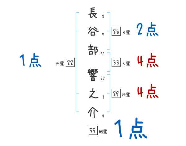 天運![]() | 長谷部響之介さんの天運は26画の2つ星!波瀾万丈かも。信頼できる人を大事にしましょう。 家系が持つ宿命的な運勢を表します。祖先から受け継いだ苗字ですので自分の力が及びません。家柄を象徴します。 |