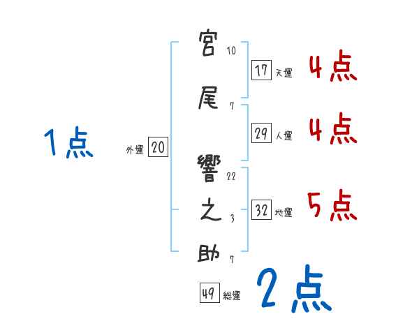 地運![]() | 宮尾響之助さんの地運は32画の5つ星!柔軟性があり成功する。チャンスが多く金運が良い。 個性を表す基礎的な運勢です。性格形成や対人関係、行動力など家庭環境に影響されます。主に誕生してから20歳くらいまでの若年期の運勢を表します。 |