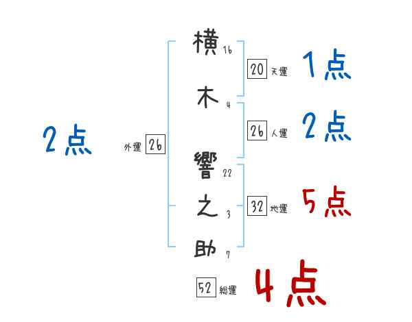 地運![]() | 横木響之助さんの地運は32画の5つ星!柔軟性があり成功する。チャンスが多く金運が良い。 個性を表す基礎的な運勢です。性格形成や対人関係、行動力など家庭環境に影響されます。主に誕生してから20歳くらいまでの若年期の運勢を表します。 |