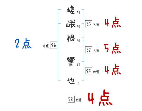総運![]() | 嵯峨根響也さんの総運は58画の4つ星!安定した生活。大器晩成タイプ。 あなたの人生を表す1番重要な運勢です。生涯を通じて影響する総合運となり、主に50歳以降の晩年期に影響を及ぼします。 |
