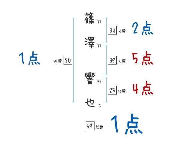 総運![]() | 篠澤響也さんの総運は59画の1つ星!意志の弱さであきらめることが多いかも。粘り強さが必要。 あなたの人生を表す1番重要な運勢です。生涯を通じて影響する総合運となり、主に50歳以降の晩年期に影響を及ぼします。 |