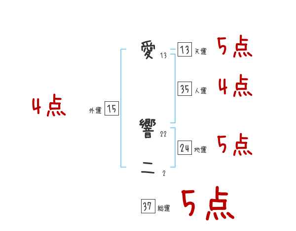 天運![]() | 愛響二さんの天運は13画の5つ星!才能に恵まれ人気がある。名声を手に入れる。円満な人生。 家系が持つ宿命的な運勢を表します。祖先から受け継いだ苗字ですので自分の力が及びません。家柄を象徴します。 |