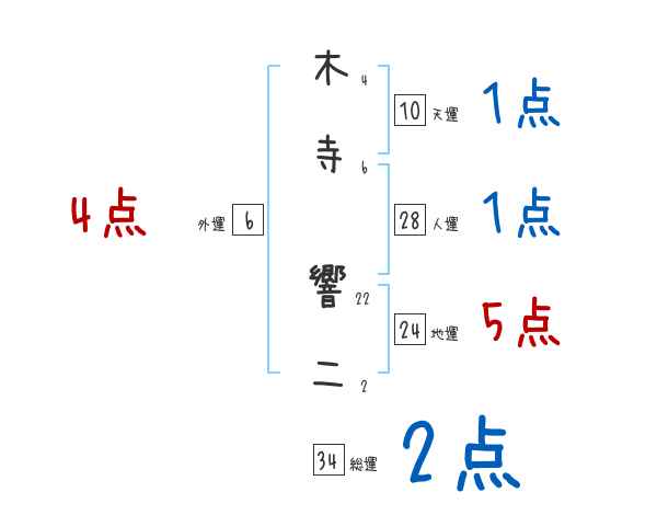 総運![]() | 木寺響二さんの総運は34画の2つ星!独創性に優れるが、自尊心が強く災難に注意しましょう。 あなたの人生を表す1番重要な運勢です。生涯を通じて影響する総合運となり、主に50歳以降の晩年期に影響を及ぼします。 |
