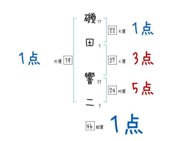 天運![]() | 磯田響二さんの天運は22画の1つ星!努力することが苦手ないっぽう手先が器用。芸術性にも優れる。 家系が持つ宿命的な運勢を表します。祖先から受け継いだ苗字ですので自分の力が及びません。家柄を象徴します。 |