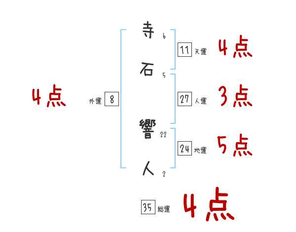 天運![]() | 寺石響人さんの天運は11画の4つ星!着実に富や地位を得る幸運な人生。 家系が持つ宿命的な運勢を表します。祖先から受け継いだ苗字ですので自分の力が及びません。家柄を象徴します。 |