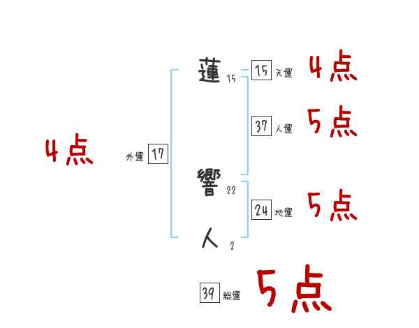 人運![]() | 蓮響人さんの人運は37画の5つ星!努力家で順応性に優れる。現実的な考え方ができ忠実に物事をこなす。 性格や才能などを表す2番目に重要な運勢です。人間関係や協調性、社会的な成功に影響します。主に20歳から50歳ぐらいまでの中年期の運勢を表します。 |