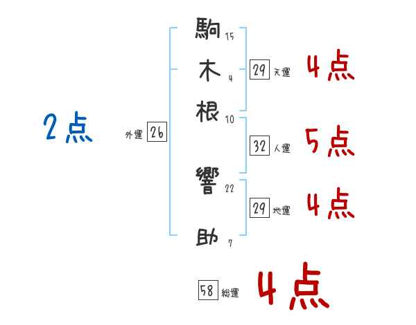 総運![]() | 駒木根響助さんの総運は58画の4つ星!安定した生活。大器晩成タイプ。 あなたの人生を表す1番重要な運勢です。生涯を通じて影響する総合運となり、主に50歳以降の晩年期に影響を及ぼします。 |