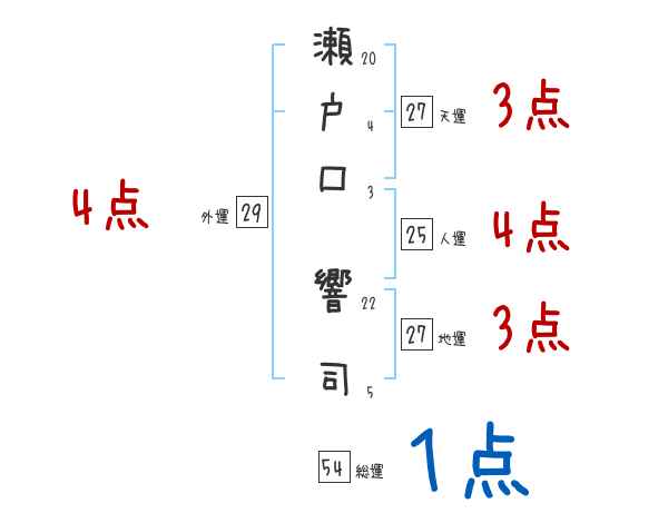 外運![]() | 瀬戸口響司さんの外運は29画の4つ星!完全主義で才能がある。厳格な心の持ち主。 生活面を象徴する運勢です。外部から受ける影響力を表し、結婚運、家庭運や職場、環境への順応性を表します。 |