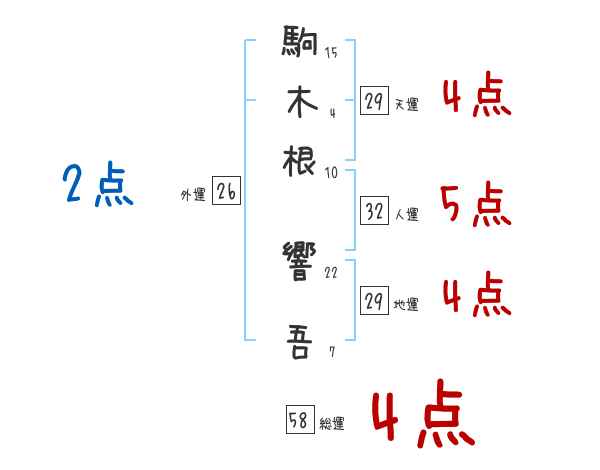 天運![]() | 駒木根響吾さんの天運は29画の4つ星!完全主義で才能がある。厳格な心の持ち主。 家系が持つ宿命的な運勢を表します。祖先から受け継いだ苗字ですので自分の力が及びません。家柄を象徴します。 |