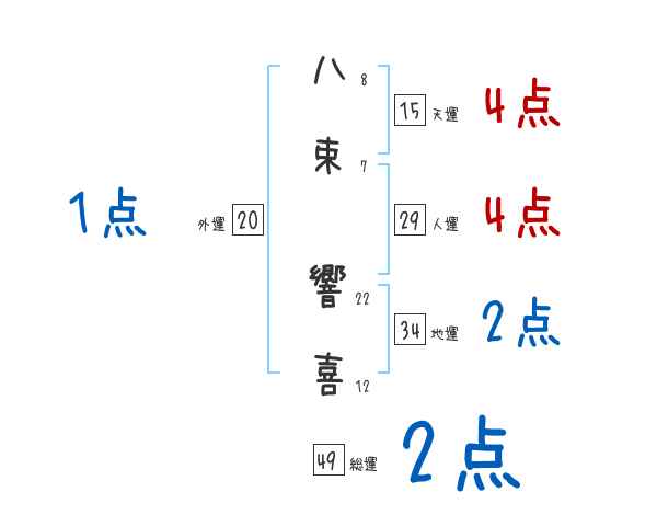 天運![]() | 八束響喜さんの天運は15画の4つ星!人徳があり出世する。順調に物事を進め円満な人生。 家系が持つ宿命的な運勢を表します。祖先から受け継いだ苗字ですので自分の力が及びません。家柄を象徴します。 |