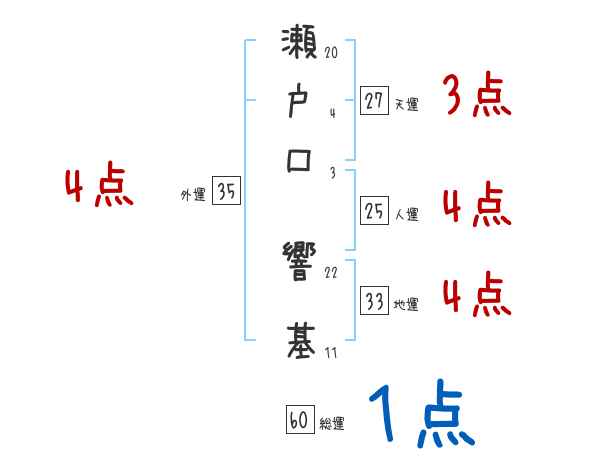 総運![]() | 瀬戸口響基さんの総運は60画の1つ星!悲観的で迷いやすい。波乱が多く損をしないように。 あなたの人生を表す1番重要な運勢です。生涯を通じて影響する総合運となり、主に50歳以降の晩年期に影響を及ぼします。 |