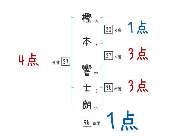 外運![]() | 樫本響士朗さんの外運は29画の4つ星!完全主義で才能がある。厳格な心の持ち主。 生活面を象徴する運勢です。外部から受ける影響力を表し、結婚運、家庭運や職場、環境への順応性を表します。 |