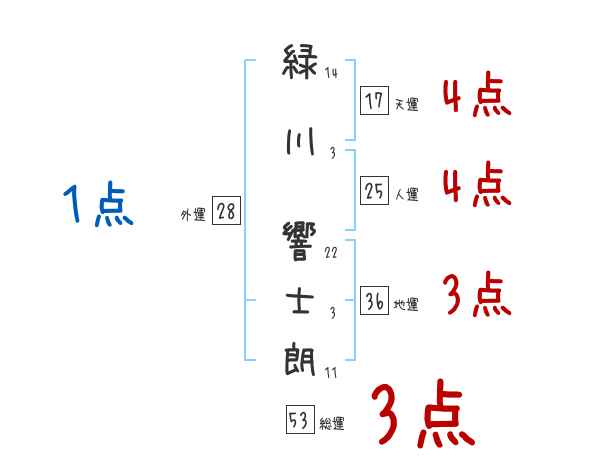 総運![]() | 緑川響士朗さんの総運は53画の3つ星!やや見栄っ張りで虚栄心がある。散財に注意。 あなたの人生を表す1番重要な運勢です。生涯を通じて影響する総合運となり、主に50歳以降の晩年期に影響を及ぼします。 |