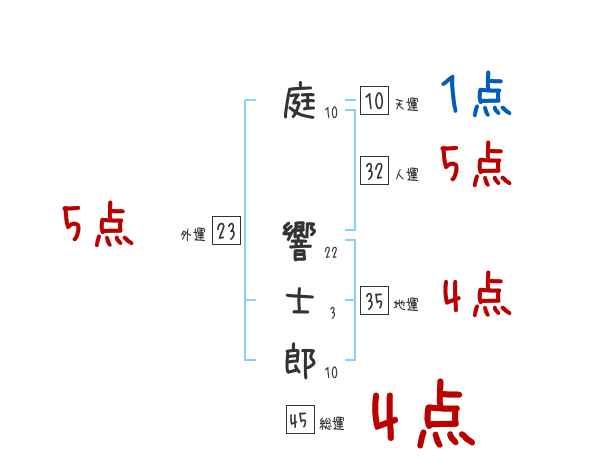 天運![]() | 庭響士郎さんの天運は10画の1つ星!不安を感じやすい傾向。ストレスを抱えないように注意しましょう。 家系が持つ宿命的な運勢を表します。祖先から受け継いだ苗字ですので自分の力が及びません。家柄を象徴します。 |