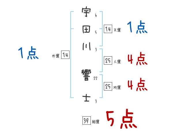 総運![]() | 宇田川響士さんの総運は39画の5つ星!社交性に優れ人望が厚い。人の上に立ち成功する。 あなたの人生を表す1番重要な運勢です。生涯を通じて影響する総合運となり、主に50歳以降の晩年期に影響を及ぼします。 |