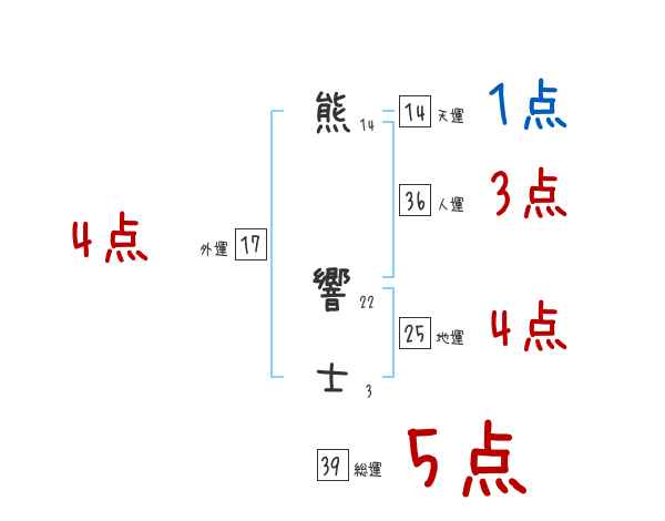 総運![]() | 熊響士さんの総運は39画の5つ星!社交性に優れ人望が厚い。人の上に立ち成功する。 あなたの人生を表す1番重要な運勢です。生涯を通じて影響する総合運となり、主に50歳以降の晩年期に影響を及ぼします。 |