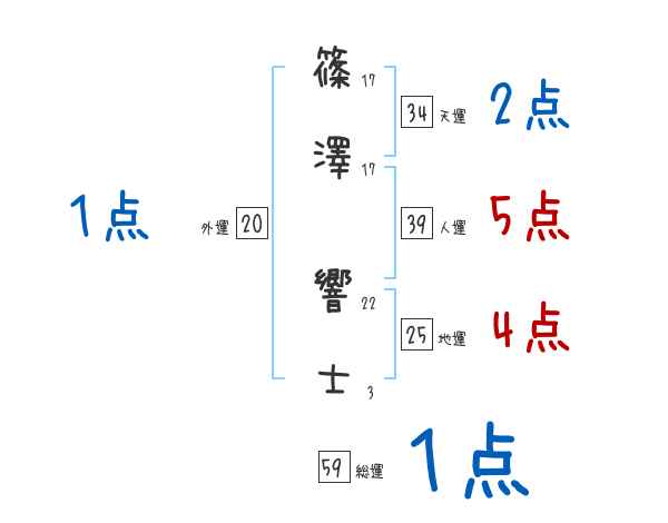 総運![]() | 篠澤響士さんの総運は59画の1つ星!意志の弱さであきらめることが多いかも。粘り強さが必要。 あなたの人生を表す1番重要な運勢です。生涯を通じて影響する総合運となり、主に50歳以降の晩年期に影響を及ぼします。 |