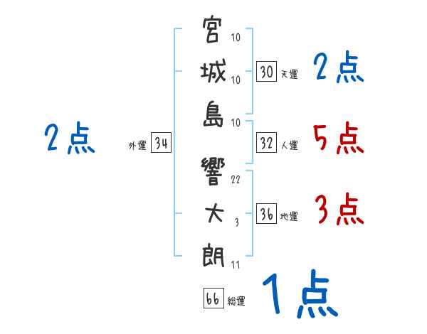 天運![]() | 宮城島響大朗さんの天運は30画の2つ星!浮き沈みの激しさに注意しましょう。 家系が持つ宿命的な運勢を表します。祖先から受け継いだ苗字ですので自分の力が及びません。家柄を象徴します。 |