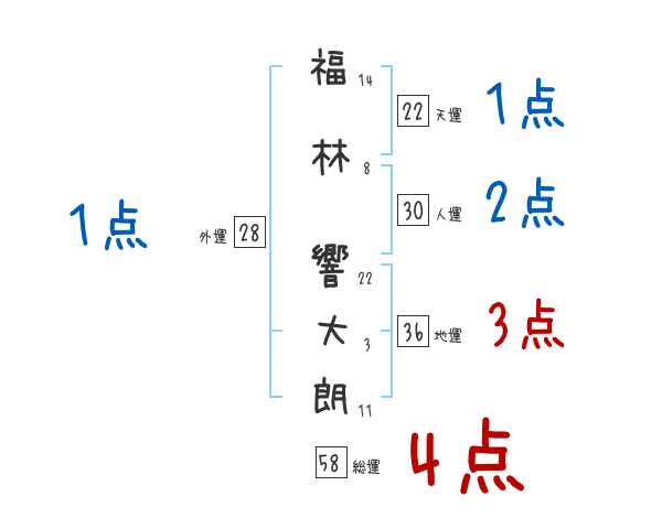 総運![]() | 福林響大朗さんの総運は58画の4つ星!安定した生活。大器晩成タイプ。 あなたの人生を表す1番重要な運勢です。生涯を通じて影響する総合運となり、主に50歳以降の晩年期に影響を及ぼします。 |