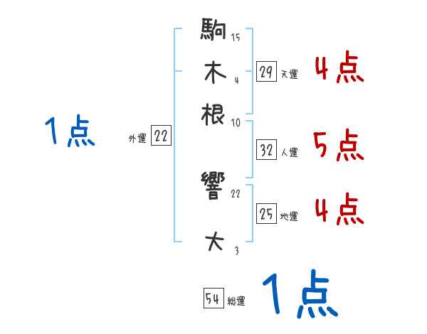 人運![]() | 駒木根響大さんの人運は32画の5つ星!柔軟性があり成功する。チャンスが多く金運が良い。 性格や才能などを表す2番目に重要な運勢です。人間関係や協調性、社会的な成功に影響します。主に20歳から50歳ぐらいまでの中年期の運勢を表します。 |