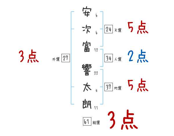 天運![]() | 安次富響太朗さんの天運は24画の5つ星!家庭運が良く順調な人生。金運にも恵まれる。 家系が持つ宿命的な運勢を表します。祖先から受け継いだ苗字ですので自分の力が及びません。家柄を象徴します。 |