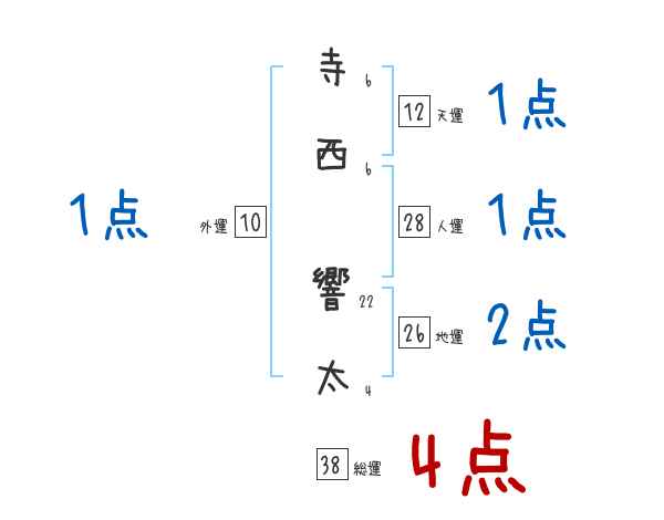 外運![]() | 寺西響太さんの外運は10画の1つ星!不安を感じやすい傾向。ストレスを抱えないように注意しましょう。 生活面を象徴する運勢です。外部から受ける影響力を表し、結婚運、家庭運や職場、環境への順応性を表します。 |