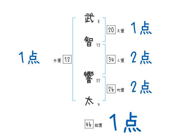 総運![]() | 武智響太さんの総運は46画の1つ星!迷走することが多く苦労するかも。目先のことにとらわれないように。 あなたの人生を表す1番重要な運勢です。生涯を通じて影響する総合運となり、主に50歳以降の晩年期に影響を及ぼします。 |