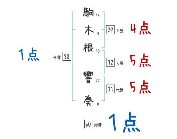 外運![]() | 駒木根響奏さんの外運は28画の1つ星!家庭環境に注意。スポーツで活躍できる能力があるかも。 生活面を象徴する運勢です。外部から受ける影響力を表し、結婚運、家庭運や職場、環境への順応性を表します。 |