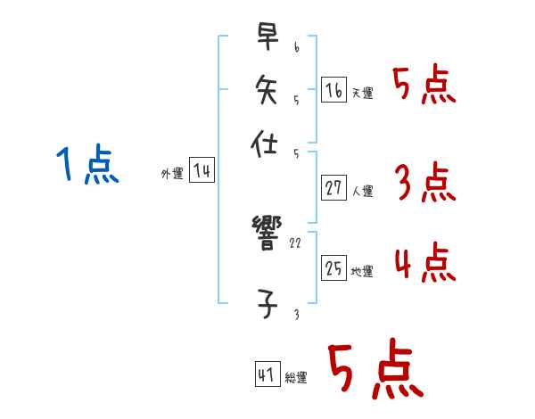 外運![]() | 早矢仕響子さんの外運は14画の1つ星!人に対して優しいがストレスを溜め込みがち。人間関係のトラブルを避けるよう気をつけましょう。 生活面を象徴する運勢です。外部から受ける影響力を表し、結婚運、家庭運や職場、環境への順応性を表します。 |