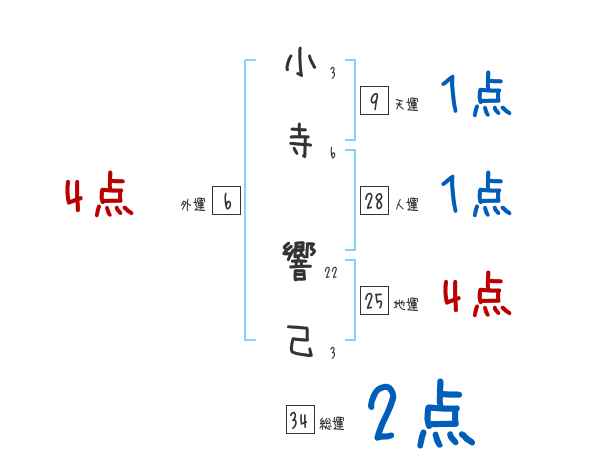 総運![]() | 小寺響己さんの総運は34画の2つ星!独創性に優れるが、自尊心が強く災難に注意しましょう。 あなたの人生を表す1番重要な運勢です。生涯を通じて影響する総合運となり、主に50歳以降の晩年期に影響を及ぼします。 |