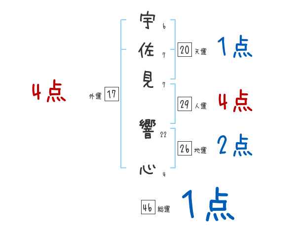 総運![]() | 宇佐見響心さんの総運は46画の1つ星!迷走することが多く苦労するかも。目先のことにとらわれないように。 あなたの人生を表す1番重要な運勢です。生涯を通じて影響する総合運となり、主に50歳以降の晩年期に影響を及ぼします。 |