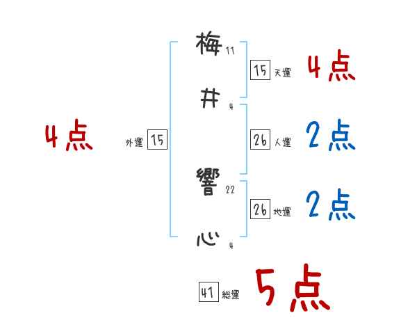 天運![]() | 梅井響心さんの天運は15画の4つ星!人徳があり出世する。順調に物事を進め円満な人生。 家系が持つ宿命的な運勢を表します。祖先から受け継いだ苗字ですので自分の力が及びません。家柄を象徴します。 |