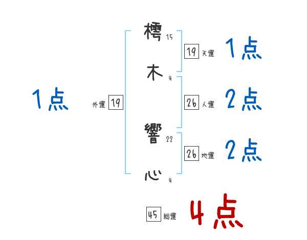 天運![]() | 樗木響心さんの天運は19画の1つ星!優れた才能を持ちますが、協調性が足りないことも。周りの人と協力する事を意識しましょう。 家系が持つ宿命的な運勢を表します。祖先から受け継いだ苗字ですので自分の力が及びません。家柄を象徴します。 |