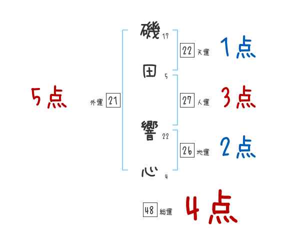 外運![]() | 磯田響心さんの外運は21画の5つ星!統率力がある。独立し成功する。名誉を手に入れる。 生活面を象徴する運勢です。外部から受ける影響力を表し、結婚運、家庭運や職場、環境への順応性を表します。 |
