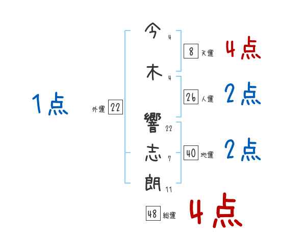 天運![]() | 今木響志朗さんの天運は8画の4つ星!勤勉家。根気強く努力し成功する。忍耐力がある。 家系が持つ宿命的な運勢を表します。祖先から受け継いだ苗字ですので自分の力が及びません。家柄を象徴します。 |