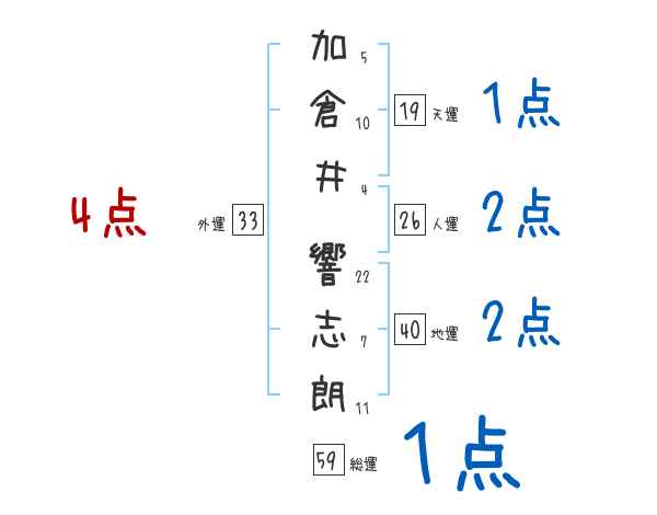 総運![]() | 加倉井響志朗さんの総運は59画の1つ星!意志の弱さであきらめることが多いかも。粘り強さが必要。 あなたの人生を表す1番重要な運勢です。生涯を通じて影響する総合運となり、主に50歳以降の晩年期に影響を及ぼします。 |