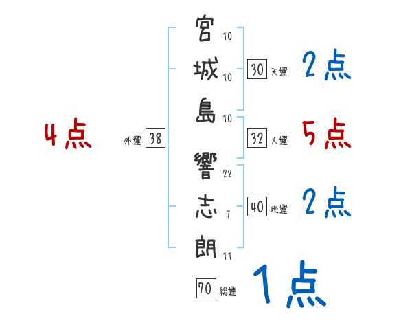 天運![]() | 宮城島響志朗さんの天運は30画の2つ星!浮き沈みの激しさに注意しましょう。 家系が持つ宿命的な運勢を表します。祖先から受け継いだ苗字ですので自分の力が及びません。家柄を象徴します。 |