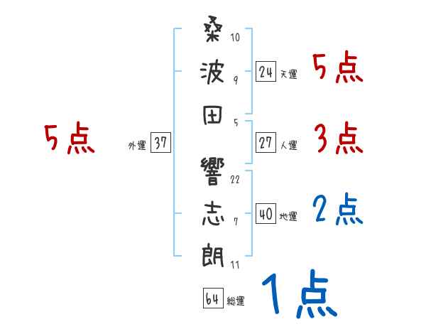 天運![]() | 桑波田響志朗さんの天運は24画の5つ星!家庭運が良く順調な人生。金運にも恵まれる。 家系が持つ宿命的な運勢を表します。祖先から受け継いだ苗字ですので自分の力が及びません。家柄を象徴します。 |