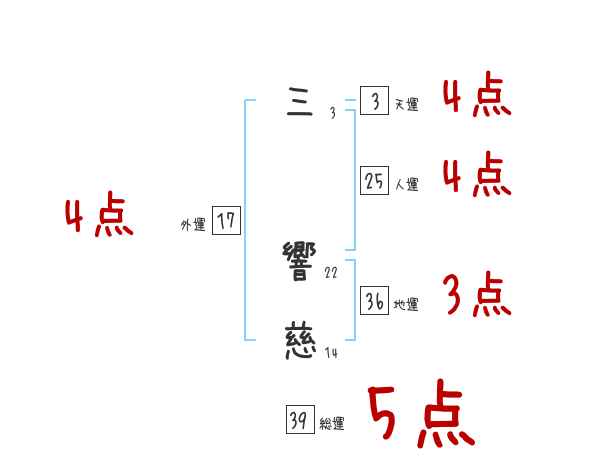 天運![]() | 三響慈さんの天運は3画の4つ星!活動的で才能に恵まれ、多くの信頼を得る。希望に満ち成長する。 家系が持つ宿命的な運勢を表します。祖先から受け継いだ苗字ですので自分の力が及びません。家柄を象徴します。 |