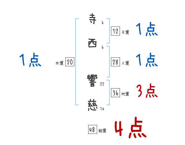 天運![]() | 寺西響慈さんの天運は12画の1つ星!簡単な失敗で諦めてしまいやすいかも。着実に行動すると良いでしょう。 家系が持つ宿命的な運勢を表します。祖先から受け継いだ苗字ですので自分の力が及びません。家柄を象徴します。 |