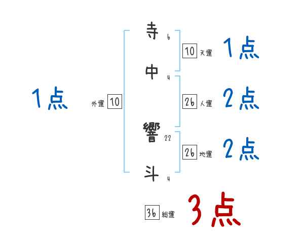 天運![]() | 寺中響斗さんの天運は10画の1つ星!不安を感じやすい傾向。ストレスを抱えないように注意しましょう。 家系が持つ宿命的な運勢を表します。祖先から受け継いだ苗字ですので自分の力が及びません。家柄を象徴します。 |