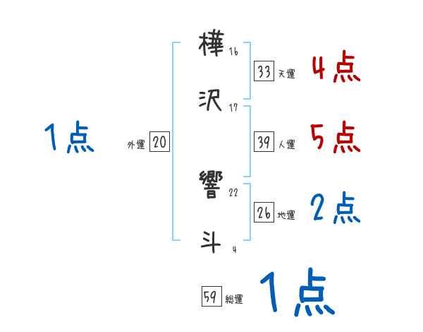天運![]() | 樺沢響斗さんの天運は33画の4つ星!権力志向でプライドが高い。勇気があり運を切り開き成功する。 家系が持つ宿命的な運勢を表します。祖先から受け継いだ苗字ですので自分の力が及びません。家柄を象徴します。 |
