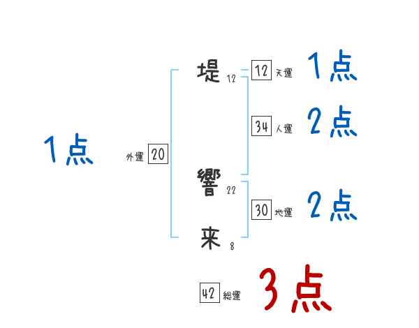 総運![]() | 堤響来さんの総運は42画の3つ星!病気に注意。多芸であるが消極的でおとなしい。 あなたの人生を表す1番重要な運勢です。生涯を通じて影響する総合運となり、主に50歳以降の晩年期に影響を及ぼします。 |