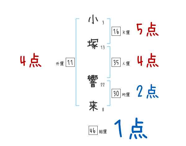 総運![]() | 小塚響来さんの総運は46画の1つ星!迷走することが多く苦労するかも。目先のことにとらわれないように。 あなたの人生を表す1番重要な運勢です。生涯を通じて影響する総合運となり、主に50歳以降の晩年期に影響を及ぼします。 |
