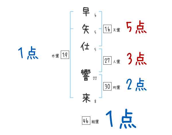 天運![]() | 早矢仕響来さんの天運は16画の5つ星!人望が厚く大きく発展する。逆転成功が見える。 家系が持つ宿命的な運勢を表します。祖先から受け継いだ苗字ですので自分の力が及びません。家柄を象徴します。 |